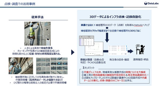 DataLabs株式会社(本社:東京都中央区、代表取締役社長:田尻 大介、以下DataLabs)は、このたび国土交通省四国地方整備局が実施する令和6年度「現場ニーズと技術シーズのマッチング」において、建設現場の課題解決を目的とした3DインフラDX技術に「Hatsuly」が採択されたことをお知らせいたします。