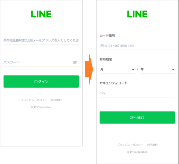 これは、「セキュリティ上の理由によりアカウントの再設定が必要」などと偽ってニセのWebサイトに誘導し、LINEのアカウント情報およびクレジットカード番号情報を入力させてそのまま盗み取る、というもの。