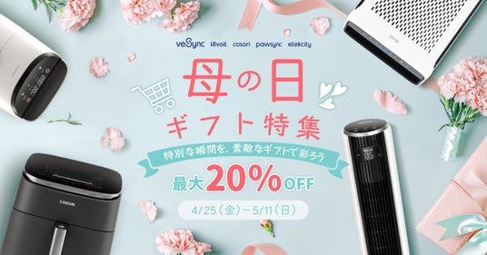 アメリカ発の小型家電メーカーVeSync(ウィーシンク)の日本支社、Vesync Japan株式会社(本社:東京都千代田区、以下VeSync)は、2025年4月25日(金)から2025年5月11日(日)まで、最大20%OFFで家電を提供する「母の日キャンペーン」をVeSync公式ストアにて開催いたします。
