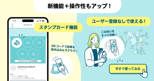 ごみ拾いや環境アクションでポイントが貯まる基本機能に加え、企業や自治体、イベント主催者が独自のスタンプカード施策を展開できる機能を追加。ユーザーが使いやすいようデザインと操作性も一新しました。