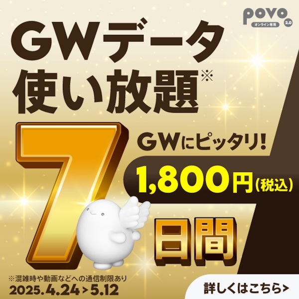 KDDI Digital Lifeは4月24日、「povoゴールデンウィークキャンペーン」を発表した。同日より開催の第1弾では、「7日間データ使い放題」など、人気のトッピングをお得な価格で提供する。