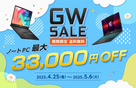 この度、エムエスアイコンピュータージャパン株式会社は2025年4月25日(金)から5月6日(火)まで、キヤノンマーケティングジャパン株式会社が運営するMSI公式オンラインショップ(以下、MSIストア)にて、ゲーミングノートPCやビジネスノートPCが最大33,000円OFFになる『MSIストア GW SALE』(以下、本キャンペーン)を開催いたします。また、本キャンペーン期間中、MSIストアでご注文いただいた商品を全て送料無料でお届けいたします。