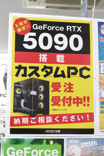 そのほか、パソコン工房 大阪日本橋店では、「GeForce RTX 5090」を搭載したカスタムPCの受注を実施しています。ビデオカード以外のパーツは自由に選択して注文できるとのこと。ビデオカードの在庫は大分改善してきたとはいえ、最上位のRTX 5090はまだまだ品薄傾向です。最強ゲーミングPC導入を考えている人はこういった機会も利用してみてはいかがでしょうか。