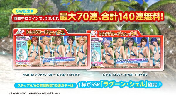 女の子10人のSSR水着「ラグーン・シェル」が、前半・後半それぞれ5人ずつのガチャで登場する。前半の期間は2025年5月2日11時59分まで、後半の期間は2025年5月2日12時~5月9日11時59分までだ。