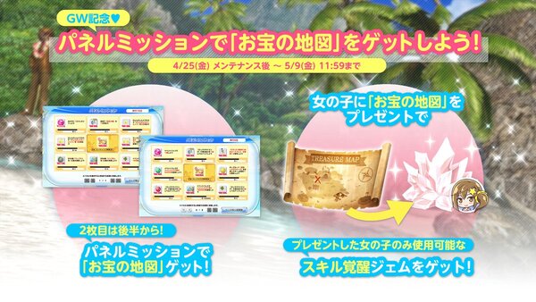 期間限定のパネルミッションの1枚目を達成すると、プレゼントアイテム「お宝の地図」を1個入手できる。さらに2025年5月2日12時から開始する2枚目も達成すると、「お宝の地図」をもう1個入手できる。