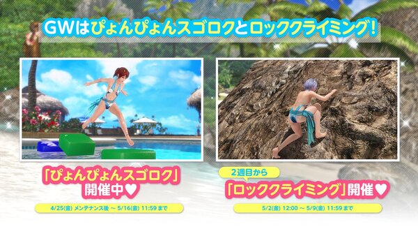 2025年5月2日12時から開催のイベント後半では、集めたイベント限定アイテムを使って「ロッククライミング」に挑戦しよう。最後まで登り切ると、女の子の「潜在能力」がレベルアップする。