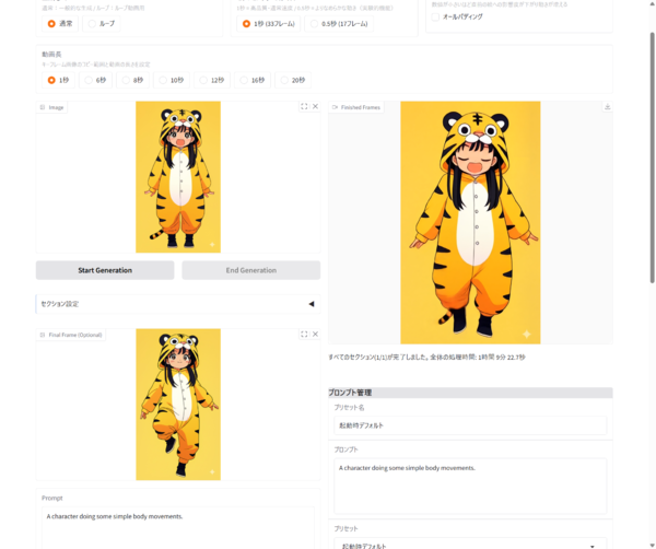 ではいったい何がどう“叡智”仕様なのか? まずはマルチキーフレーム。静止画×数枚で複雑アニメを生成しやすく。スタートフレームに加え中間フレーム、エンドフレームの静止画を与えることでその間の動作をより精緻に推論可能に。加えて、1〜20秒の定尺モードをワンクリで設定できる柔軟な動画長。また、試験実装だがHunyuanVideo系LoRAを噛ませて作風替えも可能。