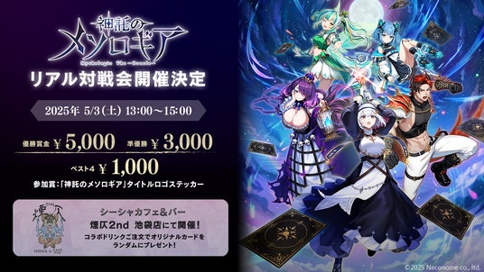 株式会社ネコノメ(本社:東京都中央区、代表取締役:工藤ショーン)は、開発中のスマートフォン向けカードゲーム『神託のメソロギア』の初となるオフライン大会を、2025年5月3日(土)に「シーシャカフェ&バー 煙仄2nd 池袋店」(東京都豊島区)にて開催いたします。本イベントは最大30名までの参加者によるリアル対戦形式で行われます。参加費は無料、参加者全員に特典ステッカーを進呈するほか、優勝者・入賞者には賞金、会場では限定のコラボドリンクやキャラクターをモチーフにしたオリジナルシーシャもご用意しております。