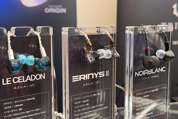 すでに「ERINYS II」が、限定生産のハイエンドゲーミングIEMとして発表されている。BA3基、10mmのダイナミック型ドライバーという構成だ。これ以外にも、10mmのダイナミックドライバー1発の「LE CELADON」とBAと10mmのダイナミックドライバーの「NOIR BLANC」が参考展示されており、近く登場するようだ。