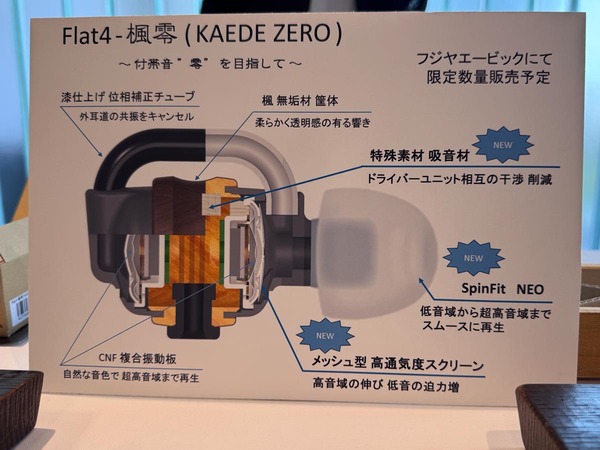 高域の不要な成分を物理的に減衰させる独特の機構を持つ「Flat 4 楓零」。新機種が参考出品されていた。「Flat 4 緋楓零」はチューブの長さが28mmに対して30mmと少し長くしている。チューブは6kHz付近で発生する共振の成分を減衰させる効果があるという。ドライバーの後ろから出る逆位相の波を当て、物理的に対策する仕組み。