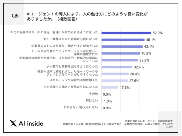 さらに、働き方に関して91.1%の導入企業が「ポジティブな変化があった」と実感している。具体的な変化としては、「AIとの協働スキルが求められるようになった」という回答が52%と最も多く、「新しい業務スキルの習得が必要になった(45.1%)」が続いた。