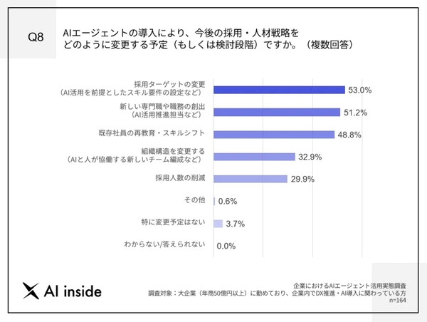また、AIエージェント導入で採用・人材戦略を変える予定の企業も多く、53%がAI活用を前提としたスキル要件の設定など「採用ターゲットの変更」を、51.2%がAI活用推進担当など「新しい専門職や職務の創出」を検討している。