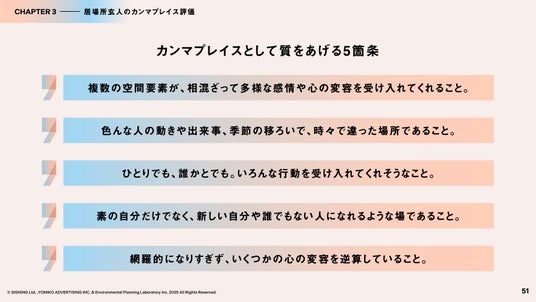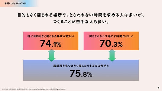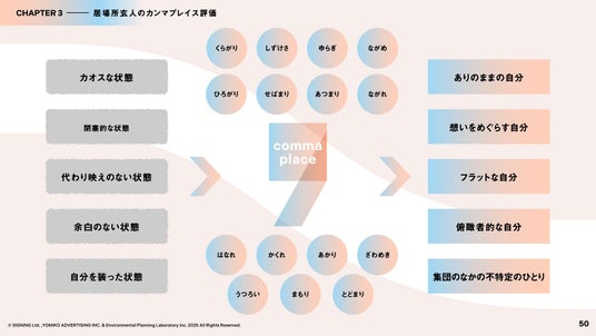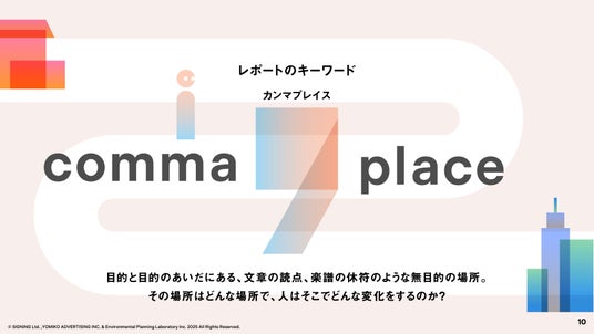 コロナ禍を経て、人々の日常は以前の日常に戻ったわけではなく、DXが生活に馴染み、オンオフ問わず「目的のある行動」「効率的な活動」が重視され、何でもない時間の価値に光を当てにくい生活となりました。そんな現代において、「なにげない」時間をウェルビーイングに過ごすためのヒントとなる「なんだかついつい居たくなる場所」を「”comma place(カンマプレイス)"=目的と目的の間の、文章の読点・楽譜の休符のような無目的の場所」と定義し、その在り方について探ります。
