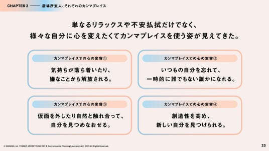 「居場所玄人」は、単なるリラックスや不安払拭だけでなく、様々な自分へと心を変容させるためにカンマプレイスを使っていた。(図表4.、5.)