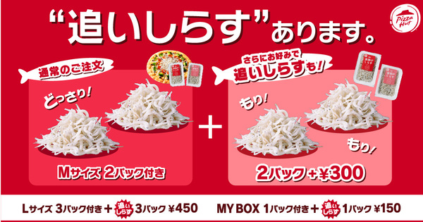 さらに、しらすをもっと楽しみたい人向けに「追いしらす」も販売しています。MY BOXなら150円、Mサイズなら300円、Lサイズなら450円で「追いしらす」を追加できます。なお、いずれも配達料はかかりませんが、生地によっては追加料金が発生する場合があります。