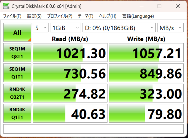 本製品のパッケージにはUSB Type-C to Type-CとUSB Type-C to Type-Aのケーブルが付属している。Type-C to Type-CのケーブルでPCに接続したところ、シーケンシャルリードで約1021MB/s、シーケンシャルライトで約1057MB/sとなった。外付けのストレージとしては十分な速度と言える。