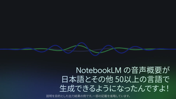 音声概要は、ユーザーがアップロードしたPDFやテキストファイルなどの資料をもとに、内容を要約した音声コンテンツを生成する機能だ。まるでパーソナライズされたポッドキャストを聞くように、資料の内容を耳からインプットできる。英語版の提供開始当初から、そのユニークな機能は多くの注目を集めていた。