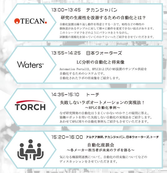 参加企業:テカンジャパン株式会社、日本ウォーターズ株式会社、アルテア技研株式会社、ダイオテック東京株式会社、株式会社ヨシキ、トーチ株式会社