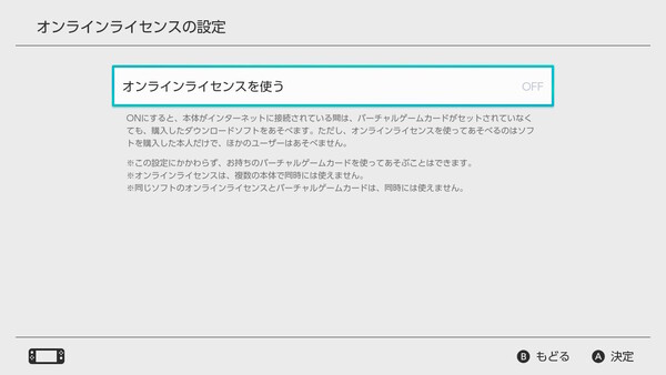 従来のように「バーチャルゲームカード」を使用せず遊ぶ際は、「ユーザー設定」から「オンラインライセンスの設定」をONにすればできる(デフォルトはOFF)。ただ、インターネット接続が常時必須になったり、ソフトを購入したアカウント以外のユーザーはソフトを遊べなかったりと不便な点が目立つ。