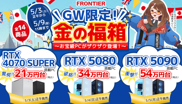 FRONTIER「金の福箱」セール開催!RTX 5090搭載PCが54万円台で登場、5月3日正午スタート