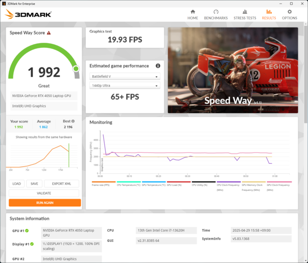 このテストが重たいものということもあって、スコアは1992とそこまで高くない。しかし、同クラス構成との比較でも平均を上回っており、エントリークラスのゲーミングPCとしては十分満足いく結果だ。