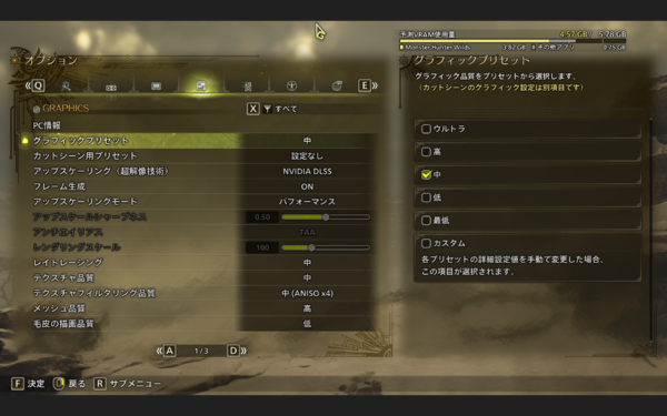 もうひとつの重量級ゲームとなる「モンスターハンターワイルズ」のベンチマークも試してみよう。こちらも高画質設定は厳しいため、グラフィックプリセットで「中」を選択。フレーム生成は「ON」、レイトレーシングは「中」とした。