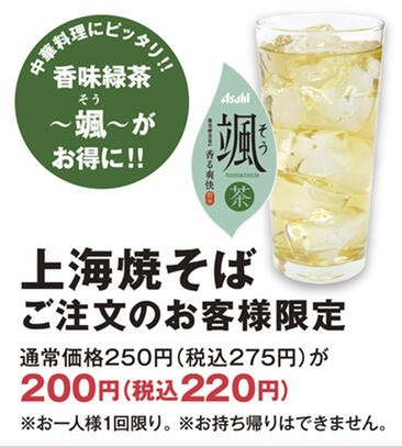 また、店内飲食では「上海焼そば」注文で「香味緑茶〜颯(そう)〜」が通常価格275円のところ、限定価格220円で注文できる。