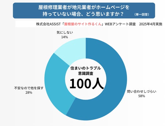 当社が実施した調査では、「ホームページを持っていない業者にどう感じるか」という問いに対し、「不安なので他を探す」が28%、「問い合わせしづらい」が58%という結果に。合わせて86%の人が“ホームページがないことにネガティブな印象”を抱いていることが明らかになりました。