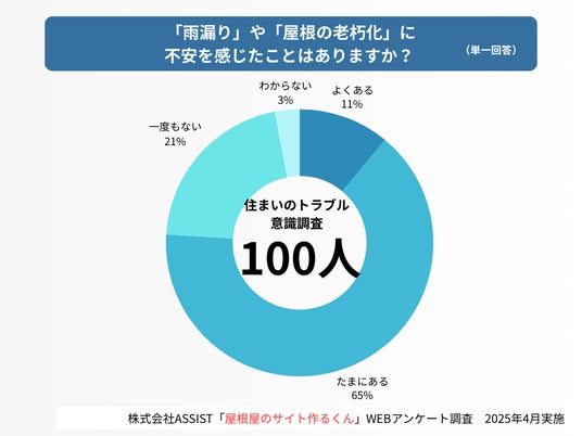 当社では、「屋根修理」「雨漏り修理」「外壁の老朽化」など、住まいに関するトラブルを経験した全国の男女100人を対象に意識調査を実施しました。