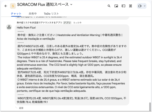 さらに、SORACOM Fluxでは新機能を用いたIoTシステム開発の手順書「SORACOM IoTレシピ/ IoTで熱中症リスクを多言語でお知らせ」を公開した。これは、温湿度センサーで取得したデータを元に、暑さ指数や不快指数を算出し、AIを利用して多言語対応の注意喚起が可能なシステムの開発手順を解説している。