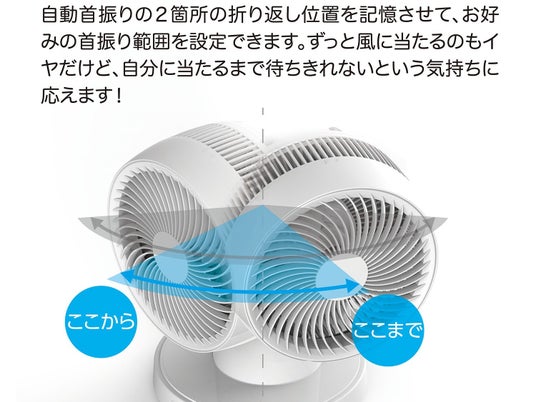 自動首振りの2箇所の折り返し位置を記憶させて、お好みの範囲に首振り角度を設定できる。