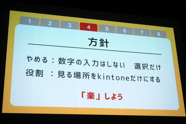 続いて、kintone導入から5~6年が経ち、金子氏が岩盤浴しながら読んだ松下幸之助の名言集には、「3%だったら今までの延長上でコストダウンできるが、3割下げるには、製品設計からやり直さなければならない」とあった。この岩盤浴の神様のお告げを受けた金子氏は、kintoneも「これまでの延長では発想が変わらないため“リボーン”」することにした。