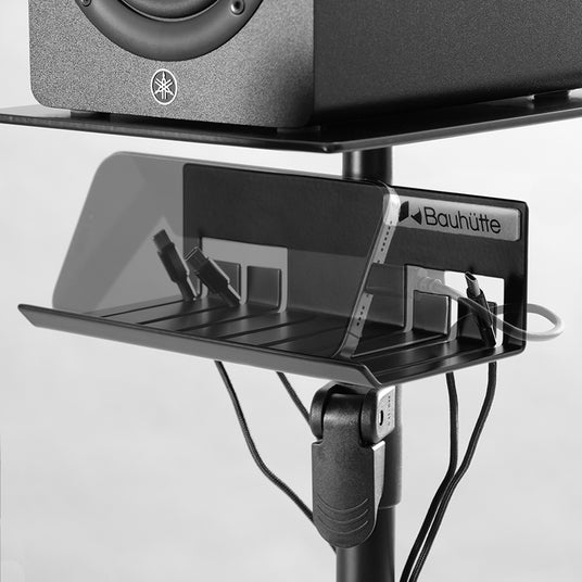 片側のスタンドの脚部にはアンプラックを搭載。小型アンプやスマートフォンなど、デスク上で散らかりがちな小物を置いておけます。ケーブルを引っ掛けるための切り欠きを付けており、ケーブル整理もできる仕様です。