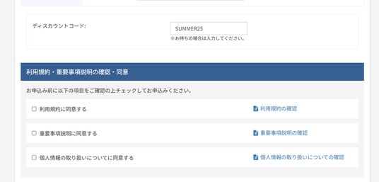 こちらの申し込みフォーム下部のディスカウントコードの欄に「SUMMER25」と入力していただければ参加完了となります。