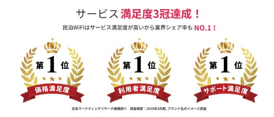 サービス満足度評価、「価格満足度第1位」、「利用者満足度第1位」、「サポート満足度第1位」という3冠を達成いたしました(2019年3月期ブランド名のイメージ調査)。