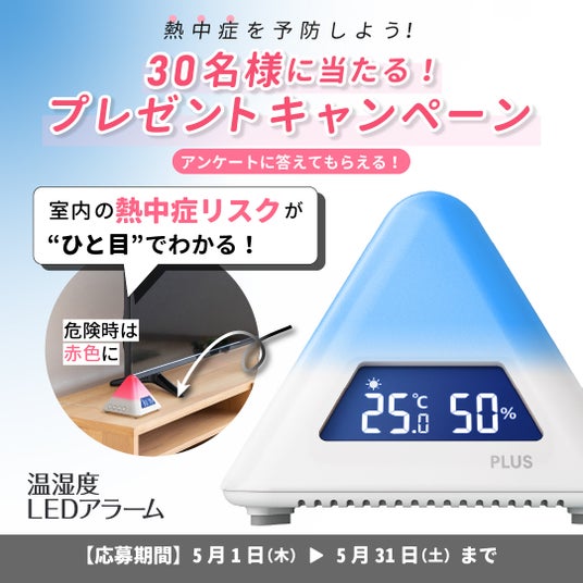 そこで、プラス株式会社は、ピラミッド型本体のLEDカラーが4色に変化して危険度を分かりやすくお知らせし、室内での熱中症対策をサポートする「温湿度LEDアラーム」のプレゼントキャンペーンを2025年5月1日から5月31日まで実施いたします。