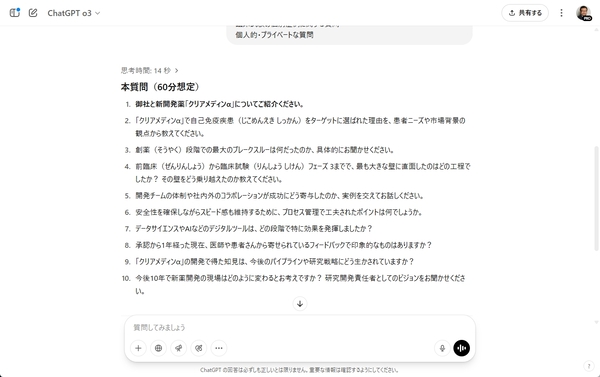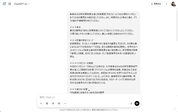 例えば「製薬会社の研究開発責任者に新薬開発プロセスについて60分間のインタビューを行うための質問を10個作成してください。特に研究開発の課題と将来展望に焦点を当てます。また、時間が余った場合に備え、プラス5個の予備質問も考えてください」といった具体的な指示が効果的だ。また、避けるべき質問のタイプや、特に掘り下げたいトピックなどの補足情報も加えると、より的確な質問案が得られる。