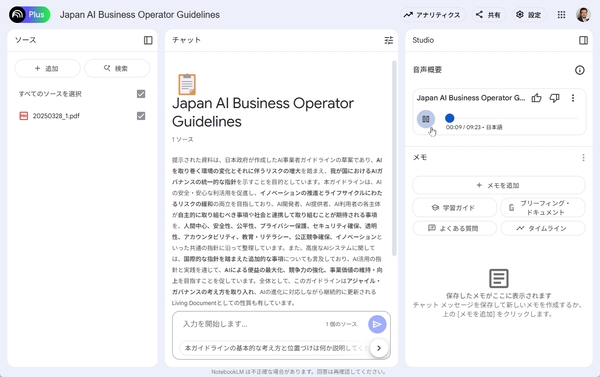 実際にこれまで使っていたノートブックで音声概要を再生したところ、驚きました。日本語をきちんと発音しており、男性と女性がポッドキャストのように会話しているのです。「えーと」などのフィラーも入れるなどリアリティもばっちり。新たな調査手段として注目を集めることになるだろう。