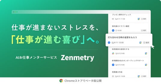 「人と仕事をなめらかに進化させ続け、大切なことに集中できる社会の実現へ」をミッションに掲げる株式会社Zenmetry(本社:東京都港区、代表取締役:長友好江、以下「ゼンメトリー」)は、5/1(木)より、AIお仕事メンターサービス「Zenmetry(ゼンメトリー)」のベータ版利用者を追加で100名を募集いたします。本サービスは、集中力が持続しにくい現代において、「集中」と「実行」を仕組み化することで、個人の能力に依存せず着実に成果を出すことを可能にします。