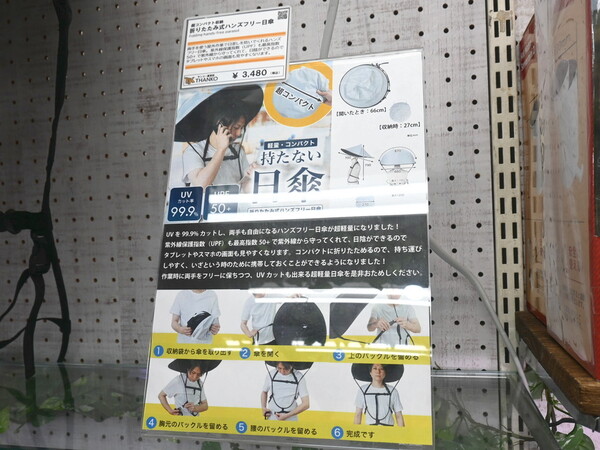 従来のハンズフリー日傘のライト版にあたり、サイズがコンパクトになった一方で、折りたたみ式のため収納して持ち運びやすくなった。重さも大幅に軽量化しており、夏の現場仕事や農作業などで重宝しそうだ。