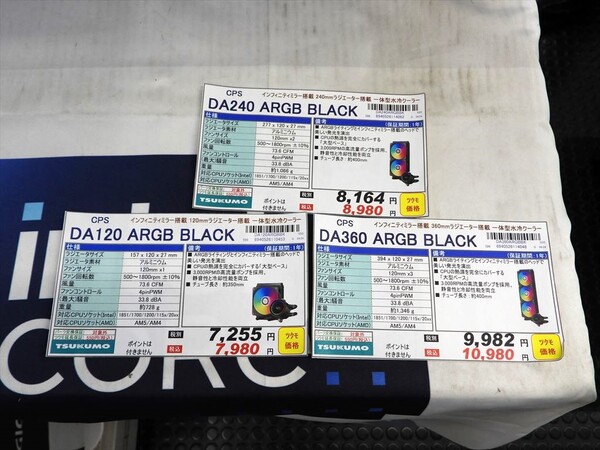 CPSから、オールインワン型水冷ユニット「DA」シリーズが登場した。ラインナップは、ラジエーターサイズ120mmの「DA120-ARGB-BK」(7980円)、240mmの「DA240-ARGB-BK」(8980円)、360mmの「DA360-ARGB-BK」(1万980円)。秋葉原では、パソコンショップアーク、ツクモパソコン本店、TSUKUMO eX.で販売中だ。