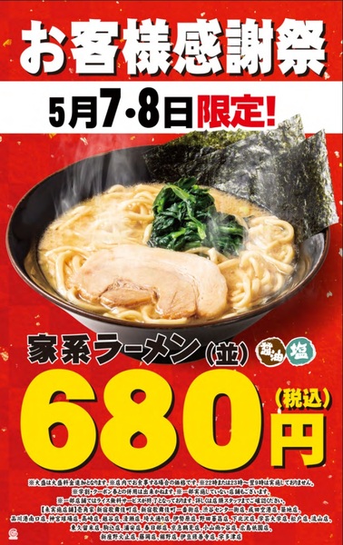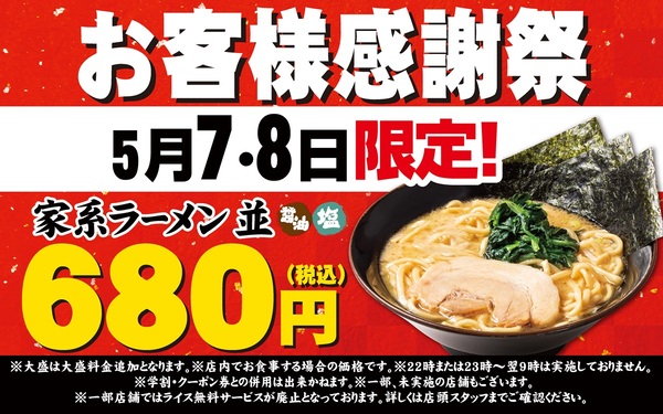 ラーメンチェーン「壱角家」は、5月7日、8日の2日間限定で「家系ラーメン並」を特別価格680円で提供するお客様感謝祭を実施します。オープンから23時までの注文が対象です(24時間営業店舗では9時~23時の注文が対象)。
