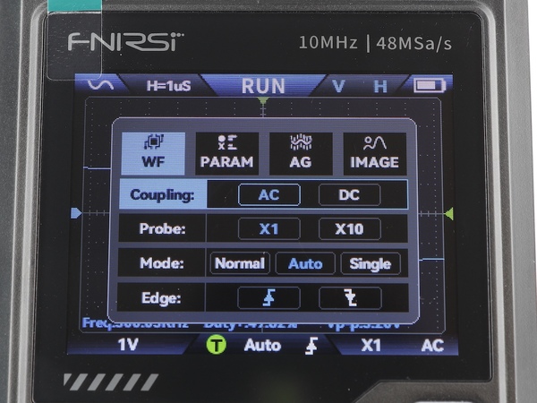 ちなみに、AUTOではなく手動で各パラメーターの変更をしたい場合は、MODEボタンを長押し。すると、AC/DCの切り替えやプローブの倍率、モードの変更などができます。項目は上下で選んでOKボタンで切り替えです。