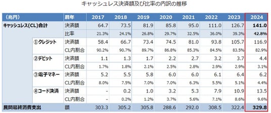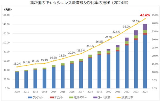 政府のキャッシュレス推進策により利用が拡大し、2024年は決済比率が42.8%と政府目標である4割を達成。
