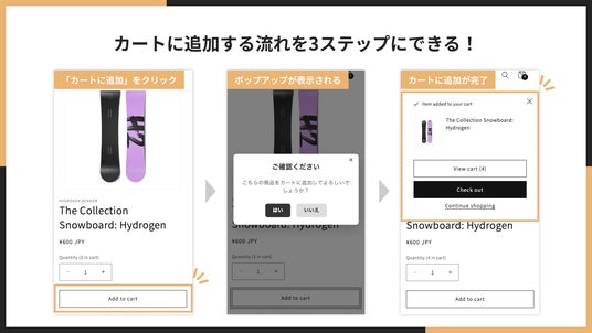 カートに追加ボタンを押した直後にポップアップが立ち上がり、購入者へ事前に了承を得る流れを実現している画面。