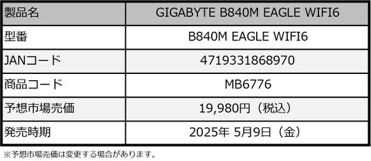 AMD B840チップセットを搭載したMicro-ATX サイズ マザーボード「GIGABYTE B840M EAGLE WIFI6」を2025年5月9日(金)に発売いたします。