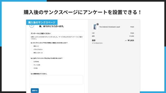 サンクスページにアンケートを表示して、顧客の感想や満足度をその場で取得できます。
