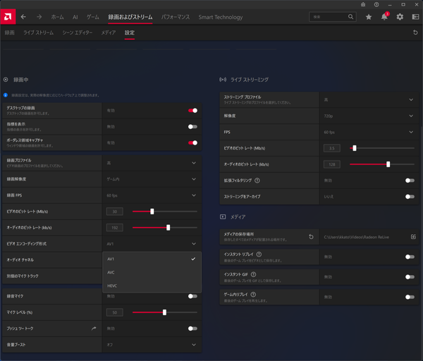 AMD Softwareはそれ自体に画面の録画&ストリーミング機能が実装されている。「OBS Studio」のような配信ツールは高度な設定ができるが、その分複雑で敷居が高い。AMD Softwareの機能はシンプルだが手軽である。RX 7000シリーズ以降ならばAV1での直接録画も可能だ。