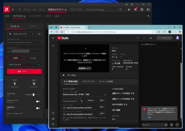 「ライブストリーム」タブで利用できるストリーミング機能についても軽く解説しておきたい。設定タブを開くとYouTubeを始めTwitchやFacebookといった著明ストリーミングサービスの項目があるが、今回はYouTubeに限定する。本来AMD Software上でログインすれば使えるようになると思うのだが、筆者の環境ではどうにも突破できなかったため、YouTubeのストリームキーを入力するやり方で解説する。
