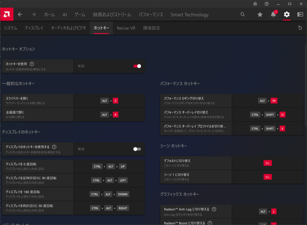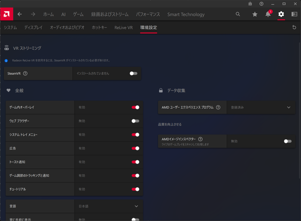 最後にAMD Softwareの右上にある歯車アイコンからアクセスできる設定もチェックしておこう。